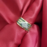 This multi-stranded, hand-wrapped 14 ct Yellow Gold Ring has 3 strings of Elephant Hair encompassing its gold, with its dramatic Diamond Shape face filled with flashing diamonds. It has diamonds totaling 0.06 ct.