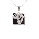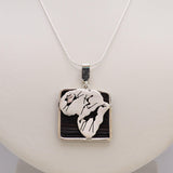 Silver Pendant with Elephant Hair Giraffe, is two silver plates, securing the strands of elephant hair between them, exposing the elephant hair under the bushman hunting springbuck and giraffe. The motif is uniquely African. Cape Diamond Exchange