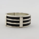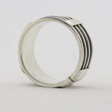 Silver ring with 6 rows of elephant hair. This unique unisex ring has 2 x 3 strands of elephant hair separated by a gleaming band of silver between each pair of strands creating a very unique look.