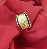 This 14 kt Yellow Gold Ring has strings of Elephant Hair to make it special and an undeniably exceptional ring souvenir from Africa. Yes, everybody loves the mythical, dignified Elephant! And hey, sometimes we just need a wide ring! The ring has an opening at the bottom and it can be adjusted to any finger size.