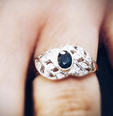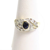 9 kt yellow gold ring with a center Sapphire size 0.48 carat and 16 small Diamonds totaling 0.10 carat. This is an intricate leaf design that makes this ring an exceptional jewelry item. It looks wonderful, and will fill you with wonder!