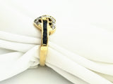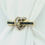 Heart-Shaped 9 karat Yellow Gold Diamond and Sapphire Ring, diamonds totaling 0.04 carat and Princess Cut Sapphires totaling 0.68 carat. This ring is retro romantic, this Yellow Gold Diamond and Sapphire Ring is fashioned into a heart shape, pressed with deeply glowing sapphires. Perfect for the woman who carries love with her wherever she goes! And it's perfect as a friendship ring. The ring comes in size is M and it can be sized but with limitations, to prevent upsetting the delicate arrangement of the stones.