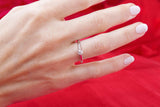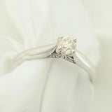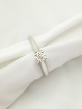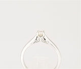 One 9-karat White Gold ring with Diamonds totaling 0.32-carat showcase one brilliant round diamond cathedral set with additional diamonds below the setting exhibiting lots of scintillation and brilliance. A solitaire ring with peekaboo diamonds makes this an enticing design to add to your collection making you feel like the Queen that you are. In conclusion, the ring is in ring size O and can be resized to fit.