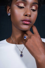 Perfectly regal, this Oval Tanzanite sits in a setting crafted of 18kt White Gold, set with a ring of superior Diamonds. It is a gorgeous piece, reminiscent of an elegant era, that carries a retro charm that will never fade.