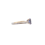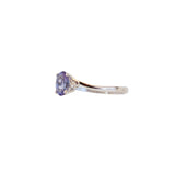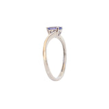 White gold oval Tanzanite and diamond twist trilogy dress ring give an experience of luxury like never before with this stunning 9-karat white gold ring. Featuring a rare and exquisite Blue Violet Oval Tanzanite weighing 0.83-carat and accented with two diamonds totaling 0.03-carat, this ring is an exceptional choice for those who desire a unique twist on the classic trilogy ring design.