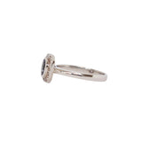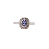 Vintage-inspired 18-karat White Gold ring with a 0.47-carat Oval Tanzanite set in a tube with 2 Diamond totaling 0.01-carat placed above and below the stone inside the detailed square top of the frame to give some sparkle. The rest of the frame is designed to give the illusion that more small diamonds are set in the frame. This is a vintage design with a breathtaking stone that gives this ring an air of grandeur making it aesthetically pleasing to the eye, you'll love it. The ring is in finger size N however it can be adjusted to fit any finger.