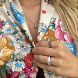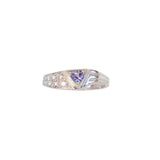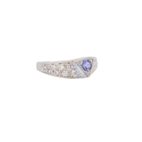Isn't she lovely! A vintage-inspired 18-karat White Gold ring with one 0.19-carat round center Tanzanite and pave Diamonds set on the band totaling 0.22-carat. A triangle frame encases the three claw Tanzanite, also the ribbed effect on the band adds to the design, while diamonds enhance its vintage look. A sexy ring to steal the show plus you can pair it up with more pieces from our stunning Tanzanite collection to create a WOW!