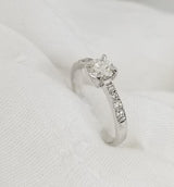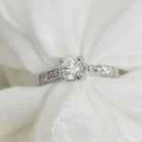 Ring aus 9-karätigem Weißgold mit einem zentralen Diamanten von 0,61 Karat und runden Brillantdiamanten auf beiden Seiten.