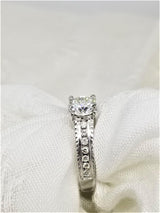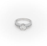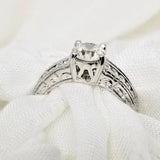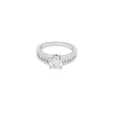 Dieser 18-karätige Diamantring mit einem runden Diamanten in der Mitte hat auf jeder Seite 7 Diamanten.