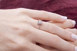 9-karätiges Weißgold mit einem zentralen Diamanten im Prinzessschliff von 0,22 Karat, gefasst in 4 Krappen, und 20 kleinen runden Diamanten von insgesamt 0,08 Karat, die den zentralen Diamanten wie eine funkelnde Linie aus Lichtern der Stadt umrahmen. Der Ring ist so schick, mit einem Hauch von Frechheit!