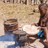 Afrikanischer Baby-Anhänger aus 18-karätigem Gelbgold. Dieser handgefertigte Anhänger stellt ein afrikanisches Baby dar, das auf einer Decke mit einem kleinen Baum und einem afrikanischen Topf mit einem großen Löffel spielt und glasiert. Der Anhänger ist ein perfektes afrikanisches Souvenir zum Mitnehmen nach Hause oder ein schönes Geschenk für einen besonderen Menschen.