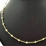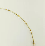 Eine wunderschöne Halskette aus 9 Karat Gelbgold, verziert mit kleinen Perlen, die wunderschön glänzen. Die Länge beträgt 42 cm, was bedeutet, dass es gut um den Hals passt. Sein minimalistisches Design verleiht ihm den Look klassischer Schönheitspaare mit jugendlicher Spannung.