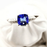 Der Ring aus 18-karätigem Weißgold mit einem Tansanit-Stein hat einen Kissenschliff von 1,72 Karat, der Ring ist mit 20 funkelnden Diamanten von insgesamt 0,42 Karat verziert, die die Seitenbänder mit einer leichten Messerkantenform schmücken, und der tief glänzende Tansanit wird mit einer 4 in Position gehalten Krallenfassung. Wir sind der Meinung, dass dieser Ring eine beeindruckende Raffinesse und internationalen Glamour besitzt! Tatsächlich werden Sie auf Ihren Reisen möglicherweise nirgendwo einen passenden Ring finden.