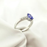 Ring aus 18 Karat Weißgold mit einem Tansanitstein von 1,11 Karat, der auf jeder Seite mit 4 Diamanten besetzt ist. Die 8 Diamanten haben insgesamt 0,08 Karat. Dies ist ein klassisches Design, das den Tansanit betont, indem es ihn leicht über das Band erhebt. Die seitlichen Diamanten sorgen für den üblichen Glanz, den wir so lieben. Sie spüren den Neid Ihrer Freunde, wenn sie Ihr schönes Stück betrachten!