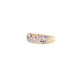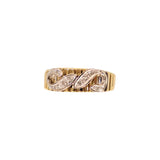 Dieses zweifarbige 18-karätige Gelbgold ist geschmackvoll und strukturiert und verfügt über das entzückendste Wirbeldesign, das die Diamanten perfekt zur Geltung bringt! Dies ist ein Kleiderring, der ein wunderschönes Geschenk sein kann, und dieser hier ist keine Ausnahme. Bringen Sie sie jedes Mal zum Lächeln, wenn sie darauf herabblickt.