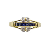 Vintage-Ring mit Saphir und Diamant im Princess-Schliff. Mit einer Reihe von sechs kanalbesetzten Saphiren von 0,48 Karat und runden Diamanten von 0,10 Karat, die sich an den Seiten verjüngen. Die Saphire sind lebendig und intensiv und sorgen für viel Funkeln, während die Diamanten einen Hauch von Mystik verleihen und es zum idealen Geschenk für jeden Geburtstag, jedes Jubiläum oder jeden besonderen Anlass machen.