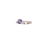 Exquisiter Tansanit- und Diamant-Kleiderring aus 9 Karat Weißgold mit ausgeschnittenem Detail auf dem Ring, bestehend aus einem runden blau-violetten Tansanit von 0,92 Karat, gefasst in vier Krappen mit zwanzig runden Diamanten von 0,11 Karat, auf dem Ring zur Maximierung eingestellt die Brillanz der Diamanten.