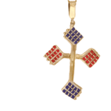 Colgante de cruz de 14 kt con cuentas africanas de color azul y rojo. Una cruz es un símbolo religioso cristiano y se dice que significa fe, buena suerte y fortuna . Se cree que el colgante de cruz protege a quien lo lleva de cualquier daño, aporta calma y paz y ahuyenta a los espíritus malignos.