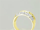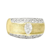 Anillo de oro amarillo de 9 quilates con circonita cúbica en forma de pera en la parte superior y algunas circonitas cúbicas más pequeñas en los bordes del anillo. La banda ancha siempre es mejor, ¿verdad? ¡Incluso en joyería! Este anillo de oro amarillo de 9 quilates con circonitas cúbicas es divinamente ancho, con circonitas cúbicas que rebotan luz a cada lado. ¡Sé llamativo, está permitido!