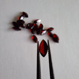 A lovely Garnet Stone in a Marquise cut. A marquise-cut stone is an elegant, elongated shape with pointed ends. Its design creates the illusion of a larger stone and gives the finger a longer, slender look.