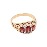 Anillo de vestir de oro amarillo con tres piedras, granate y diamantes