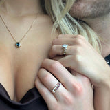 Este topacio azul oscuro en oro amarillo es la piedra de nacimiento de noviembre y habla de fuerza. La calidez del oro amarillo realza el azul de la piedra, evocando recuerdos de inocencia y asombro infantil al tiempo que da una apariencia de madurez.