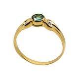 El diseño es en Oro Amarillo de 18 kt con un Berilo Verde redondo de 0,26 quilates con dos Diamantes a cada lado de la piedra.