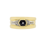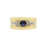 Este anillo de diamantes y zafiro hexagonal de oro amarillo de 9 quilates consta de tres bandas de oro fusionadas para crear un anillo que incluye un zafiro de 0,30 quilates encerrado en un bisel hexagonal junto con diamantes en pavé de 0,02 quilates a cada lado de la banda central.