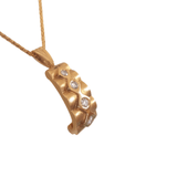 Colgante curvo ondulado con diamantes en oro de 18kt. ¡El colgante parece metal corrugado pero aquí está hecho de oro! ¡¡Que agradable!! Comienza ancho y se estrecha a medida que llega a la fianza. O comienza angosto en la parte superior y se hace cada vez más ancho. Es curvo y se puede ver claramente en la imagen de vista lateral.