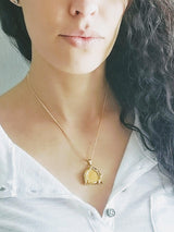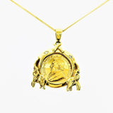 Este Kruger Rand de 1/10 de oz es de oro de 22 quilates y se encuentra en un marco de oro amarillo de 18 quilates, con elefantes a cada lado y dos diamantes de 0,01 quilates en la parte superior.