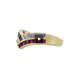 Este anillo de diamantes y rubíes de oro amarillo de 9 quilates hecho a mano está engastado con dos filas de rubíes y diamantes redondos: hay trece rubíes de talla princesa con un total de 0,32 quilates y diamantes con un total de 0,10 quilates en una formación de espoleta. Como también podrás notar, los diamantes están ahí para acentuar el rojo escarlata de los rubíes, y lo hacen. Como sabrás, los rubíes son piedras fantásticas y nunca pasan de moda, así que mantente a la moda y llama la atención dondequiera que vayas.