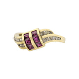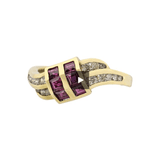 Anillo con hebilla en forma de remolino de diamantes y rubíes en oro amarillo de 9 quilates