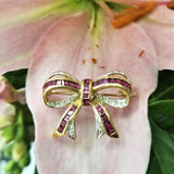 Siéntete como un maravilloso regalo a punto de ser desenvuelto. Este broche con forma de lazo centelleante se presenta en una caja de regalo de oro amarillo de 9 quilates lleno de rubíes y diamantes. ¡Es un regalo perfecto para otra persona o para darse un capricho! Te lo mereces.