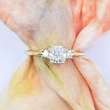 Anillo de compromiso de trilogía de diamantes de talla cojín en oro amarillo