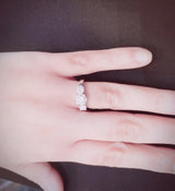 La belleza y elegancia de este anillo son verdaderamente incomparables y es el complemento perfecto para cualquier colección de joyas. Ya sea que esté buscando una pieza llamativa para una ocasión especial o algo para usar todos los días, este anillo de trilogía de oro blanco y diamantes seguramente llamará la atención y causará una impresión duradera. Este anillo es para dedo talla O y se puede ajustar a cualquier talla.