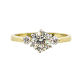 El trío de diamantes, sostenido por seis garras, brilla y parpadea alegremente contra el oro amarillo de 18 quilates, creando una apariencia de pura felicidad. Al igual que las tres pequeñas palabras que le dices, este anillo simboliza el amor y el compromiso duraderos.