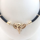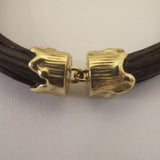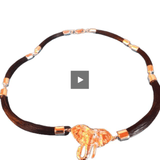 The Elephant Hair Choker is a unique piece of jewelry that features elephant hair strands woven together and held in place by metal caps. It is designed to be worn as a choker, which is a close-fitting necklace that typically sits at the base of the neck. The necklace also features an elephant front at the center, which adds to its exotic appeal.