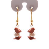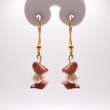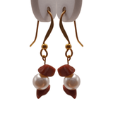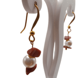 A pair of earrings with glass pearl-finished beads and polished sandstone hanging on a shepherd hook.